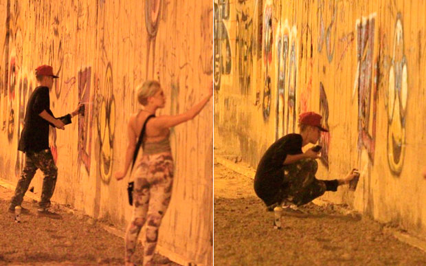 Os desenhos feitos por Justin Bieber no muro do hotel Nacional foram cobertos por tinta branca na terça, por um dos fotógrafos que se desentenderam com a equipe do cantor durante a madrugada.