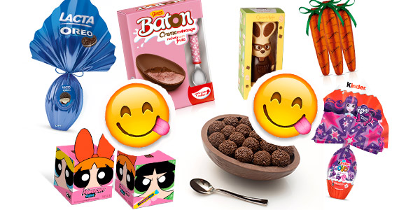 1- Ovo OreoLacta 356g (R$ 43,90*); 2- Baton de colher sabor morango Garoto 73g (R$ 15,99*); 3- coelho de chocolate Cacau Show 70g (R$ 13,90*); 4- cenouras de chocolate Kopenhagen 50g (R$ 16,90 cada*); 5- mini ovinhos de chocolate ao leite Meninas SuperpoderosasBrasil Cacau (R$ 29,90*); 6- ovo recheado de brigadeiro Sodie Doces 500g (R$ 49,90*); 7- Kinder OvoMy Little Pony 100g (R$ 44,89*). Fotos: